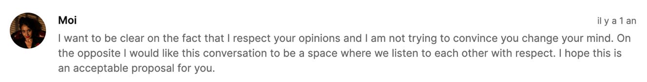 Yet, some spaces are better suited for dialogue. If you ever want to try this kind of experiment in a more protected setting, I would rather recommend My Country Talks, a one-hour exchange between people with opposing political views. When I did it, I was matched with Samuel, a 56 years old conservative. We disagreed on almost everything until we landed on immigration. There, a strange fact-based overlap: one shard of shared ground. And maybe that was enough. As philosopher Myriam Revault d’Allonnes puts it, "a society that gives up on the idea of shared facts is a sick society."