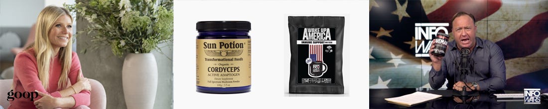 On opposite ends of the ideological spectrum, lifestyle wellness brand Goop and conspiratorial nationalist media brand Infowars promote the same functional products: cordyceps and maca mushroom supplements. One embeds them in a vocabulary of pleasure and intimacy (“Sun Potion”,“Sex Dust”), while the other frames the same product through national vigilance and virility (“Wake Up America”,“Super Male Vitality”).