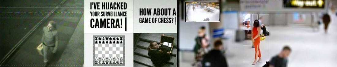 Mediengruppe Bitnik created Surveillance Chess during the 2012 London Olympics. A woman with a yellow suitcase enters a London tube station under CCTV surveillance. She opens the suitcase, flips a switch. The surveillance feed shifts. On the control centre monitor: a chessboard appears. A voice broadcasts through loudspeakers: “I control your camera now. I’m the one with the yellow suitcase. How about a game of chess? You’re white. I’m black. Call or text me to make your move.” By intercepting the unencrypted signal between camera and control centre, Bitnik forces reciprocity where there had only been a unilateral gaze. The watcher becomes player. The monitoring system becomes a communication medium. The game begins. Open-ended.